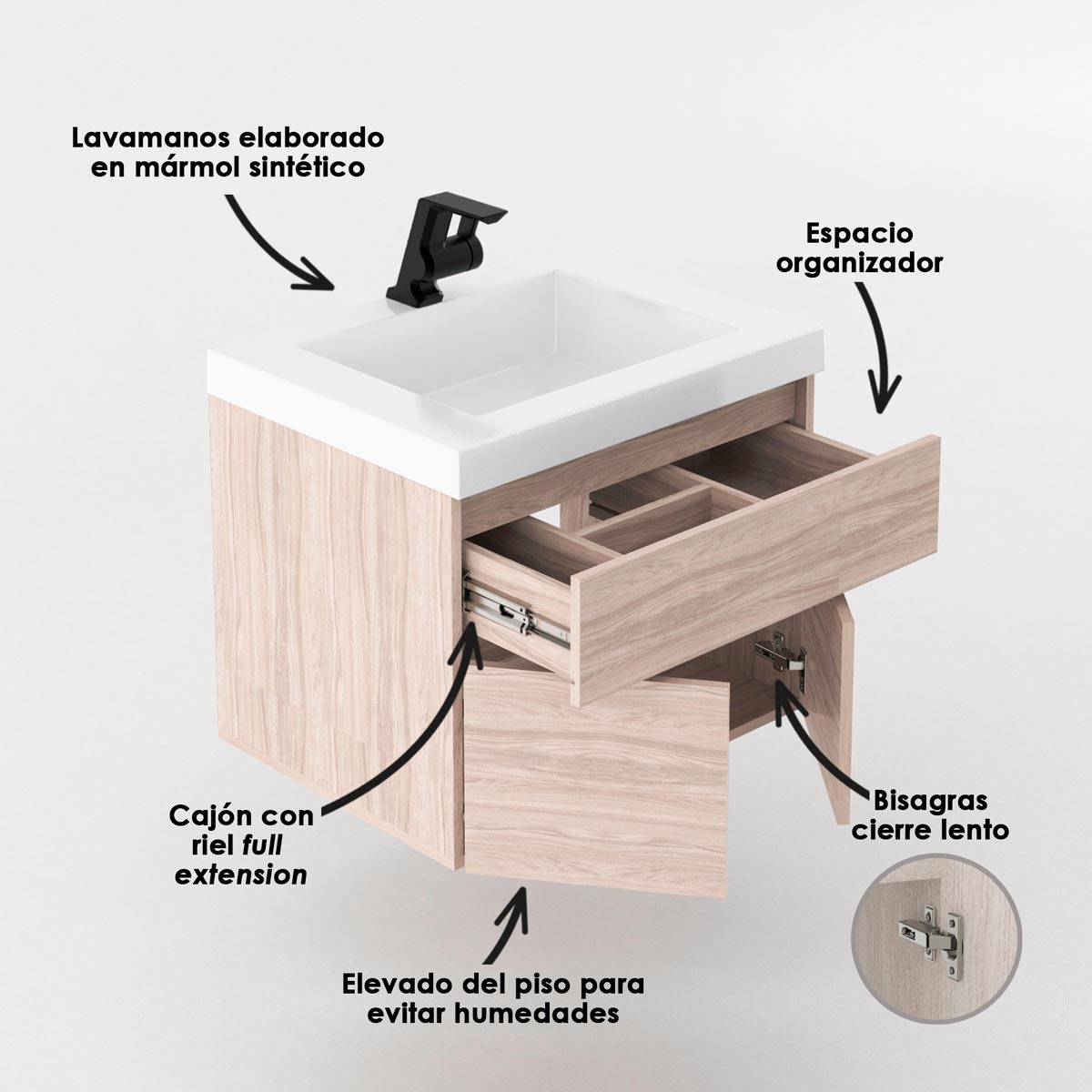 Combinación moderna entre el lavamanos con diseño moderno y mesón integrado. Mueble Macao con amplio espacio de almacenamiento, elegante y fácil de armar, conjunto que evoca estilo y practicidad para su baño.