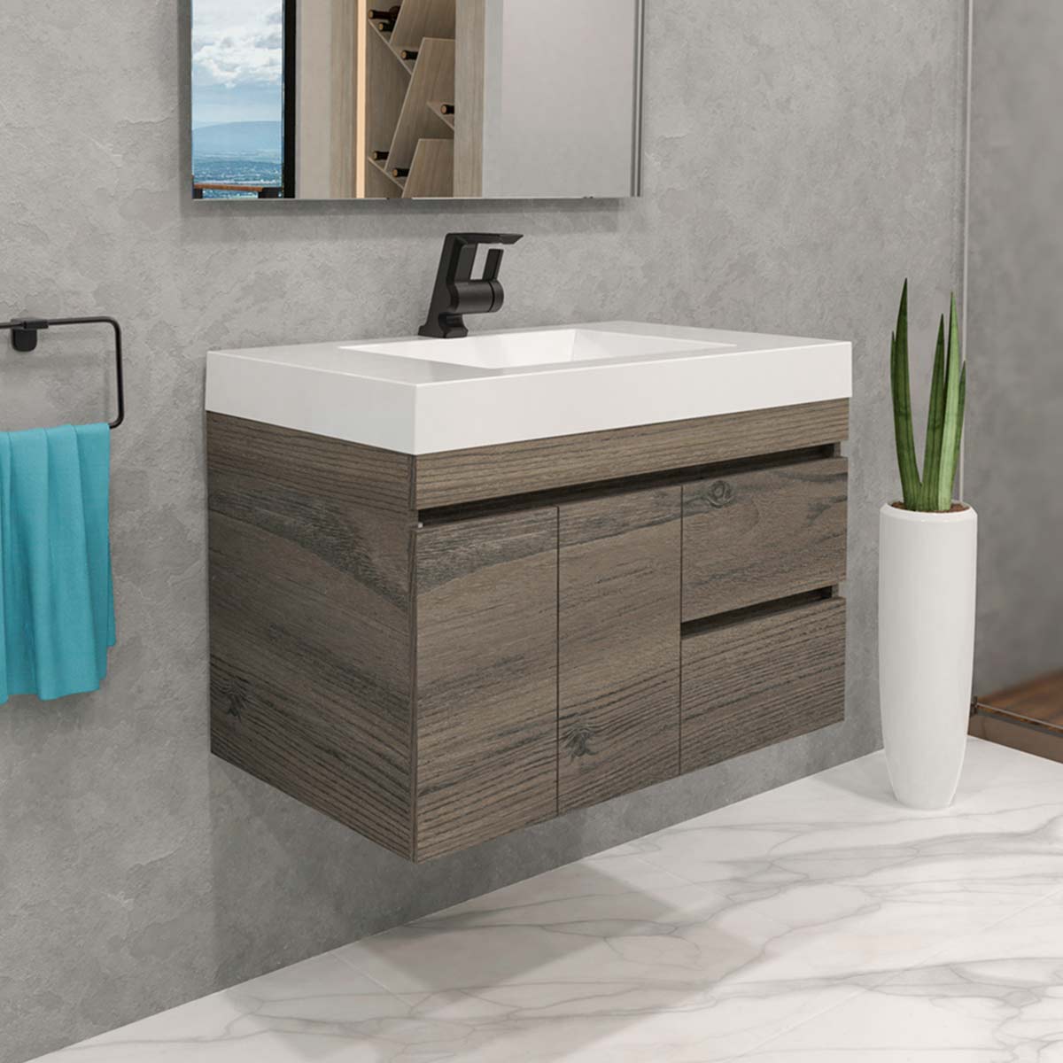 Combinación moderna entre el lavamanos Oslo con diseño minimalista y el mueble Vitelli Class de amplio espacio de almacenamiento, conjunto que evoca estilo y practicidad para su baño.