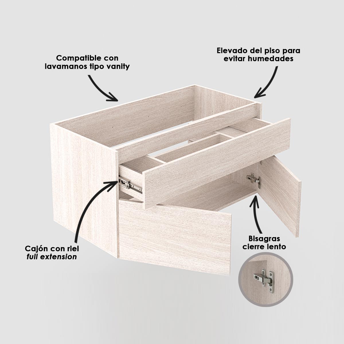 - Mueble elaborado en aglomerado de 15 mm enchapado en melamina, con canto de 2 mm en frentes