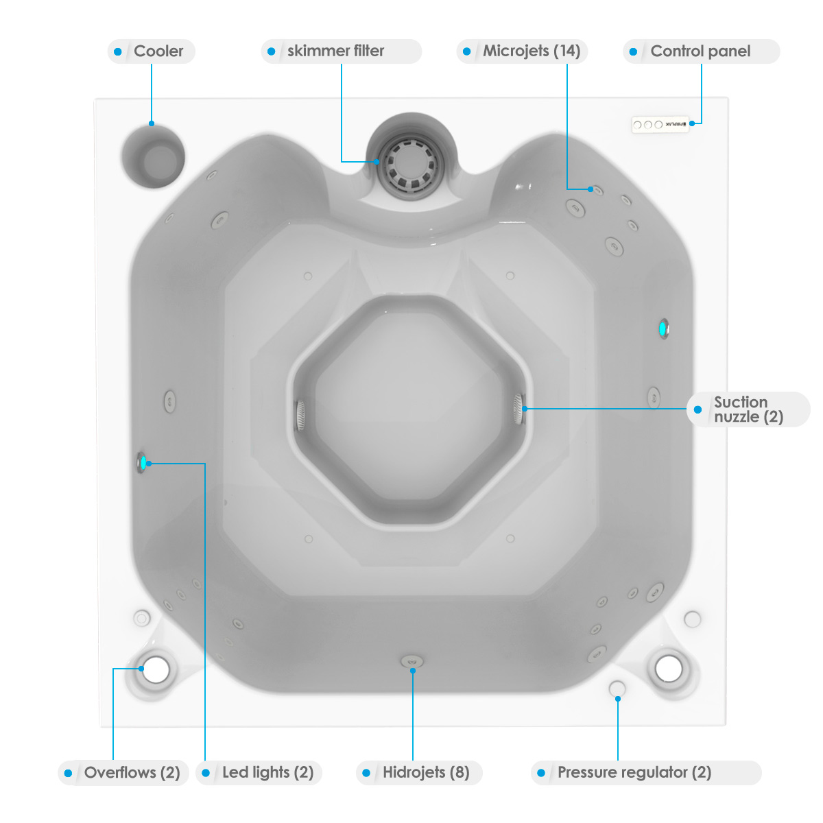 Whirlpool for 2 person, ergonomic design with 22 powerful jets to perform massages on the main muscle areas of the body.
