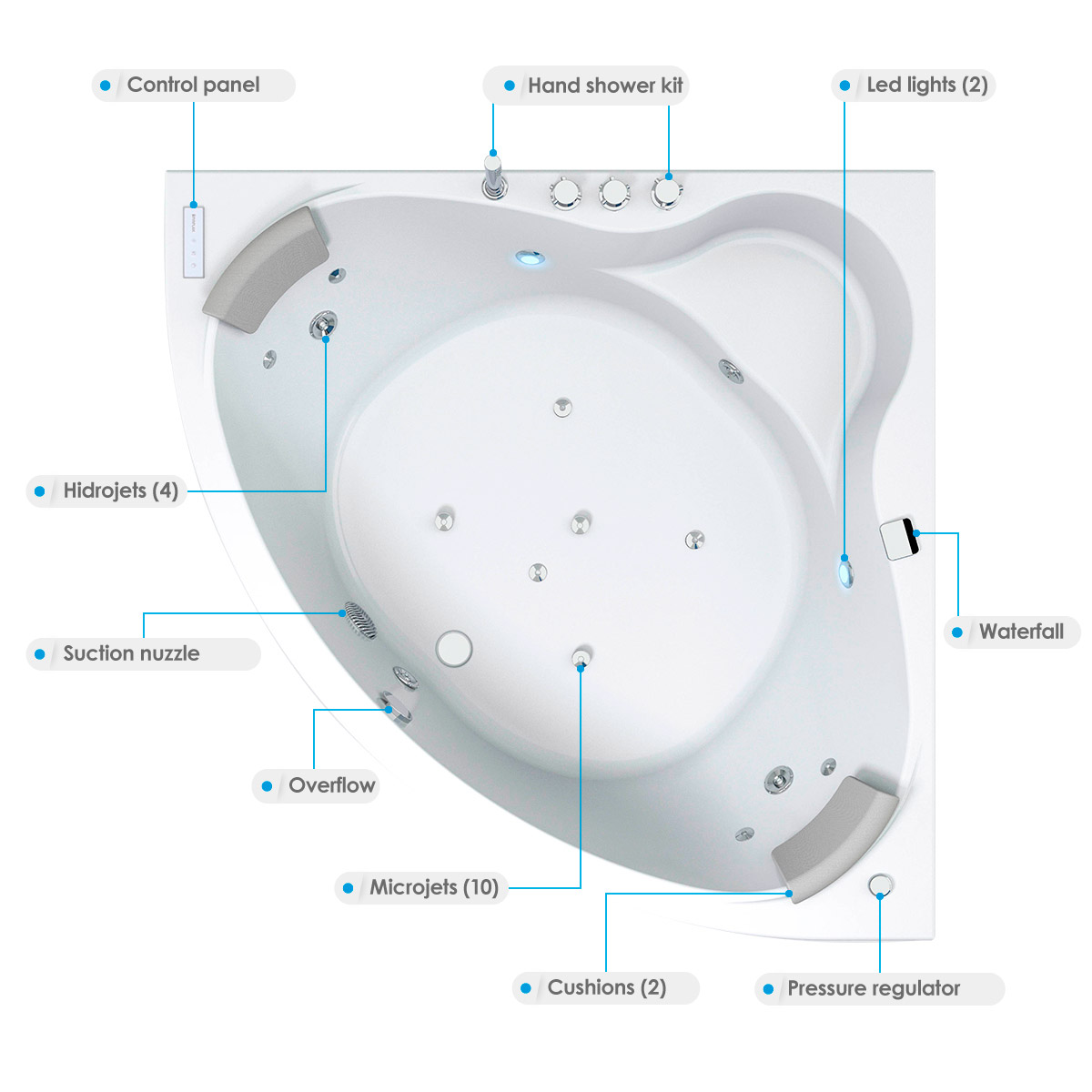 Temperature controller: keeps the water warm while the hydromassage system is in use. It is not a heater.