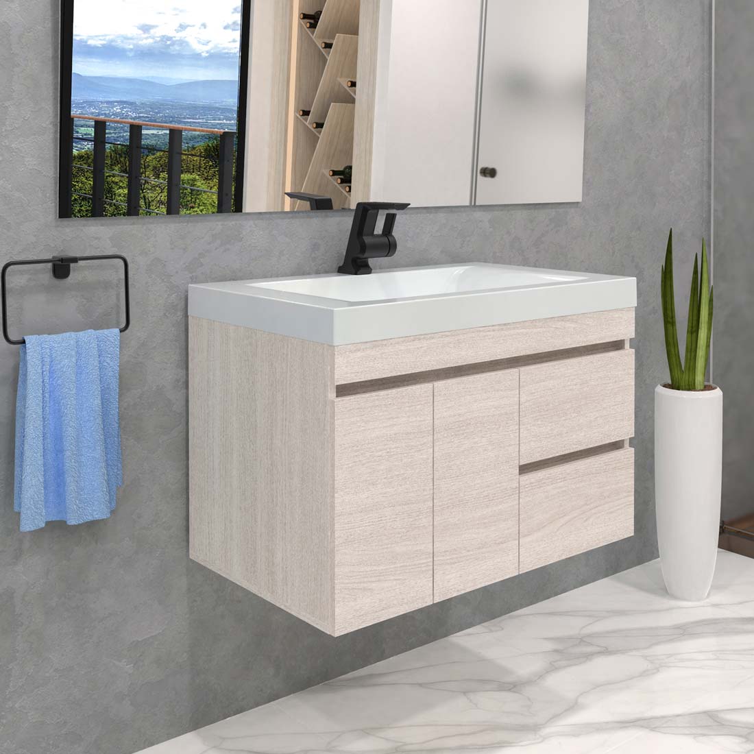Los muebles de FIRPLAK para complementar este lavamanos son elaborados en aglomerado y enchapados con melamina. Conservan el mismo color por dentro y por fuera y son fáciles de armar.