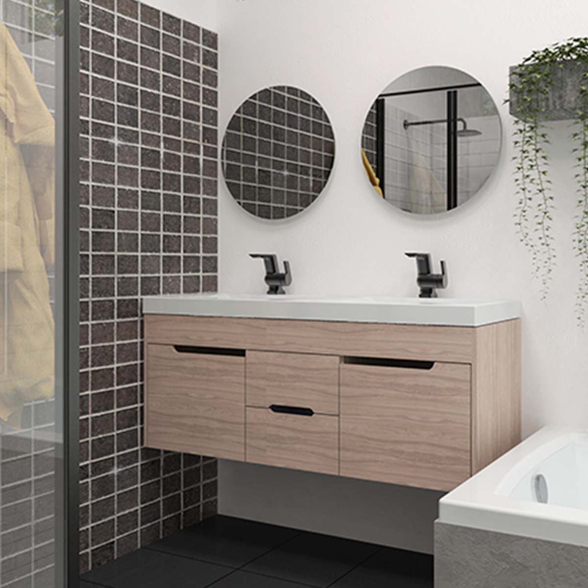 Lavamanos con diseño estético e innovador, líneas suaves que evoca elegancia y le aporta una apariencia moderna, en combinación con mueble Tiziano de diseño vanguardista con puerta y cajones sin manijas, diseño curvo en frentes para lograr un ambiente renovado al interior de tu baño.