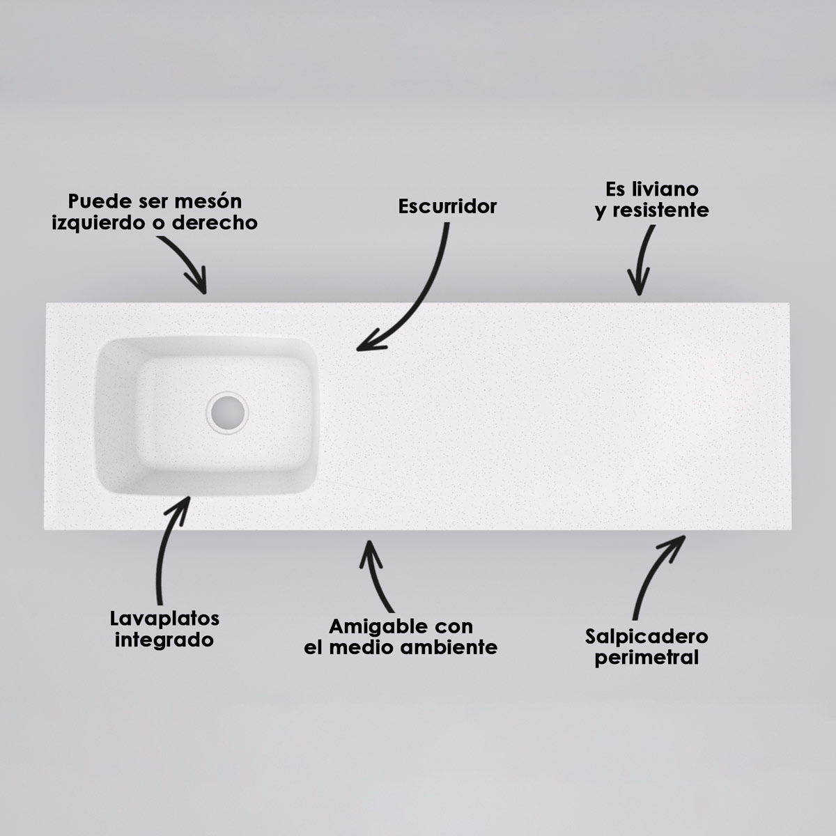 • The countertop includes an integrated sink (one piece without joints).
