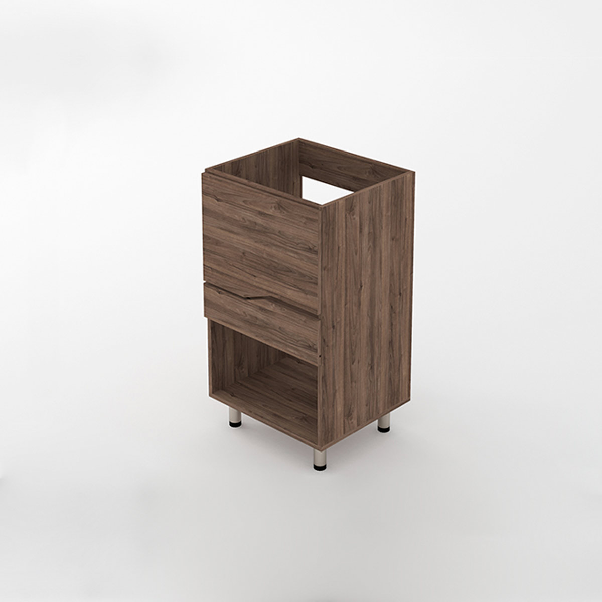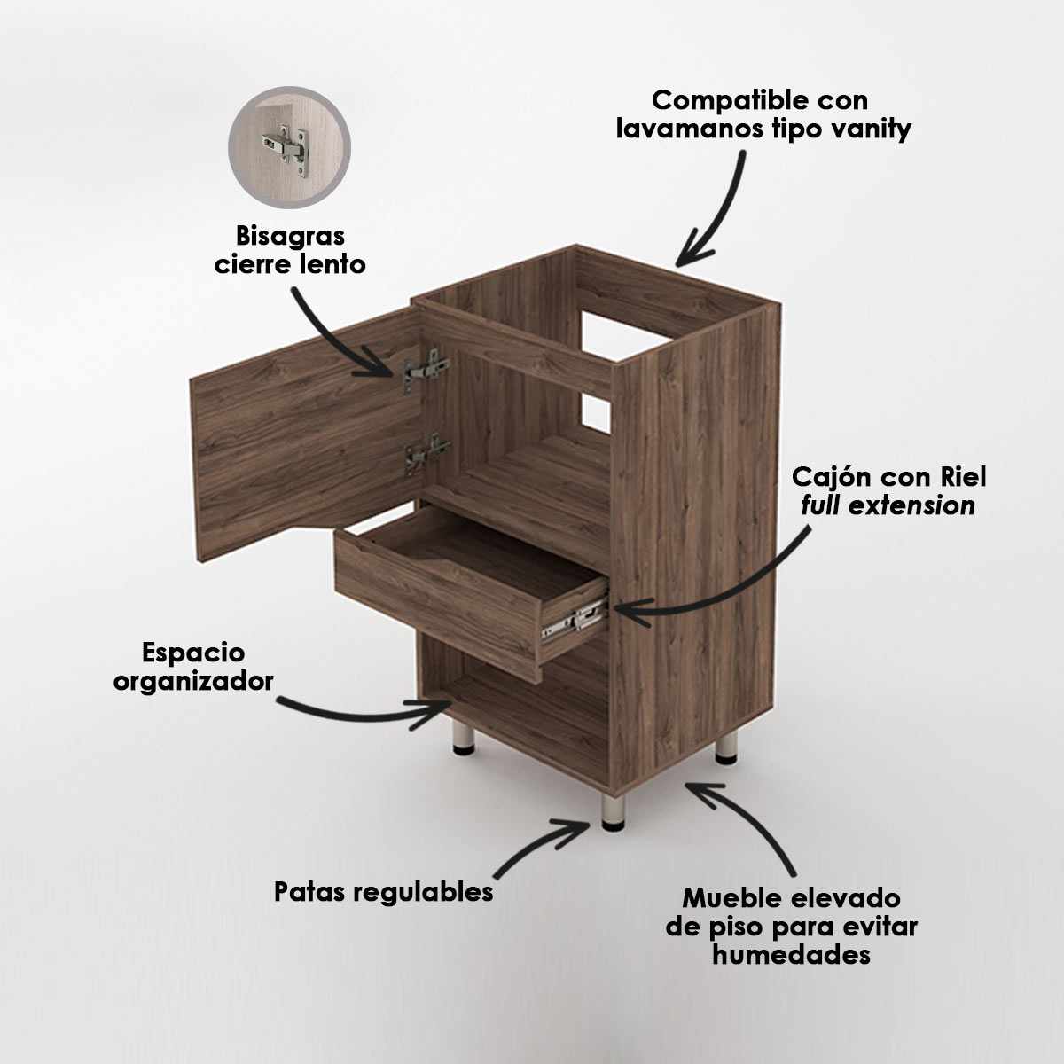 Cabinet with adjustable legs, without handles, basic and aesthetic design compatible with vanity-type washbasins. The cabinet has a large storage space with an organizer niche, elevated from the floor to prevent dampness, and easy to assemble. Compatible with vanity-type washbasins.